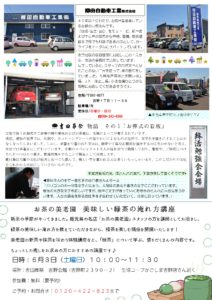 裏面は、柳田自動車株式会社をご紹介しています。吉野の発展とともにある車屋さんです。区画整理による移動で仮店舗での営業中だそうです。