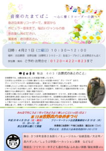 裏面では、吉野兵六ゆめまつりのご案内や、4月21日(土)に吉野会館で開催される、リコーダーの演奏会についてご紹介しています。イベントの詳細は以下のリンクをご覧ください。