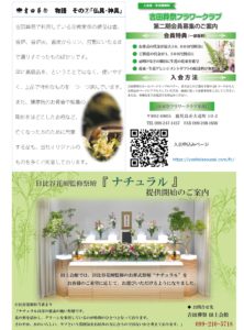 また、田上会館限定で取り扱っている、日比谷花壇監修のナチュラル祭壇について掲載しております。グリーンやガラスの花器を多用した、やわらかいやさしい雰囲気の祭壇です。関東では、いわゆる和風の祭壇よりも人気が出ているそうです。